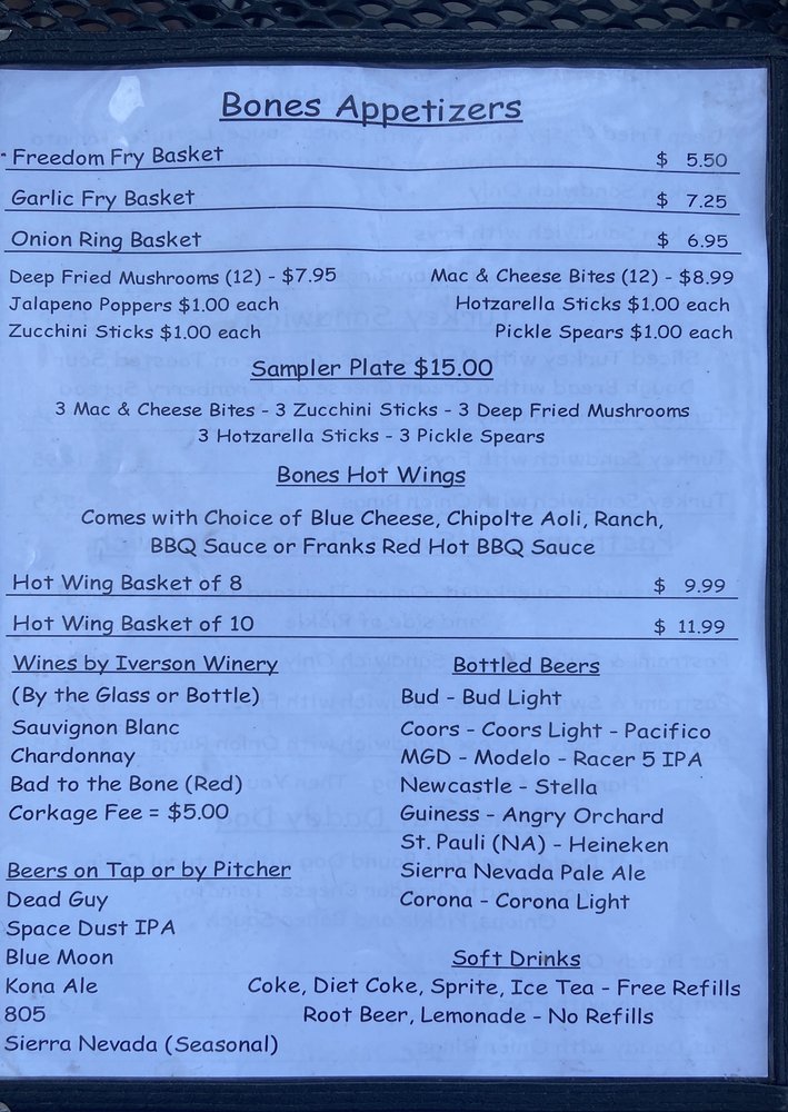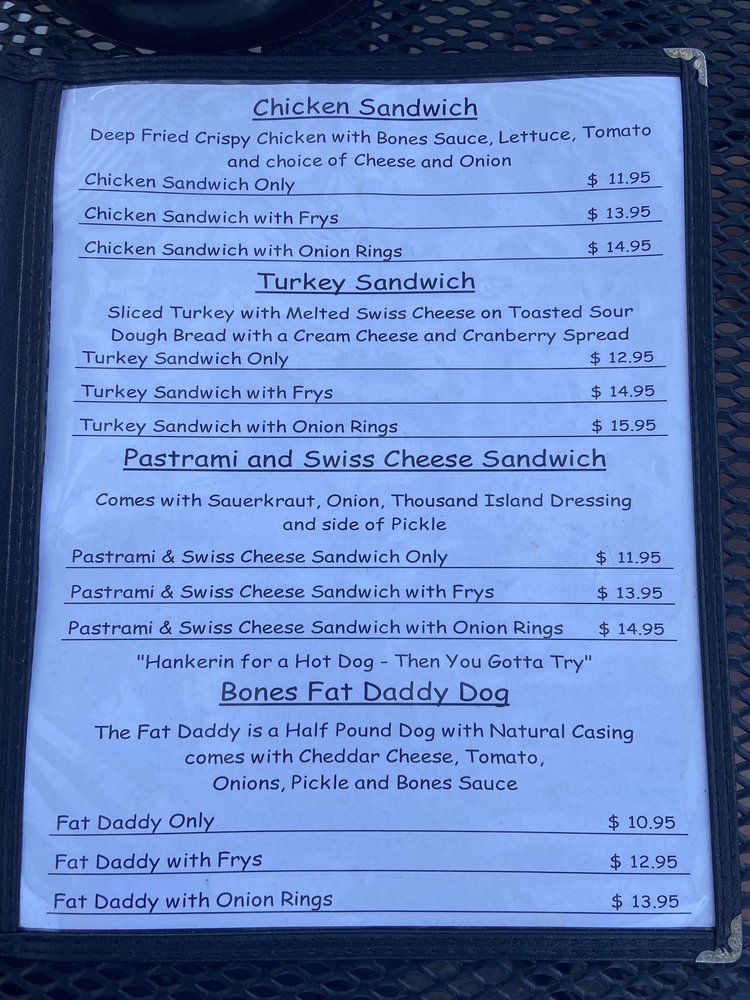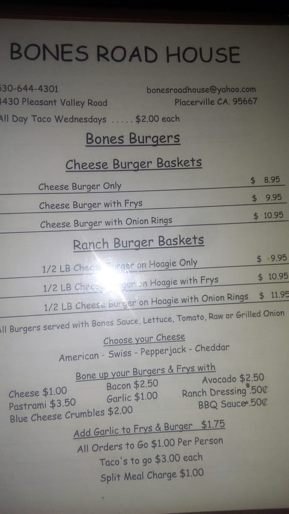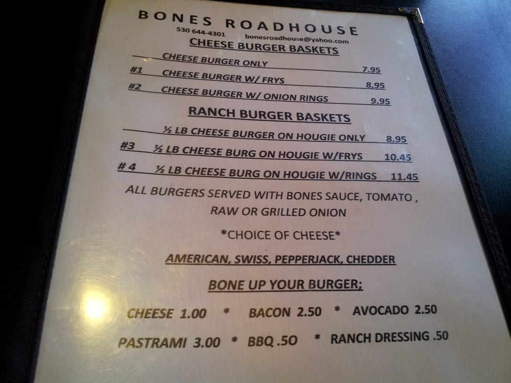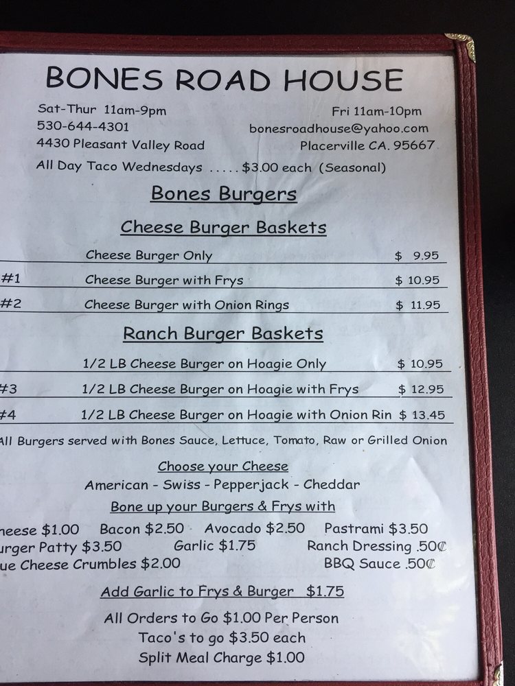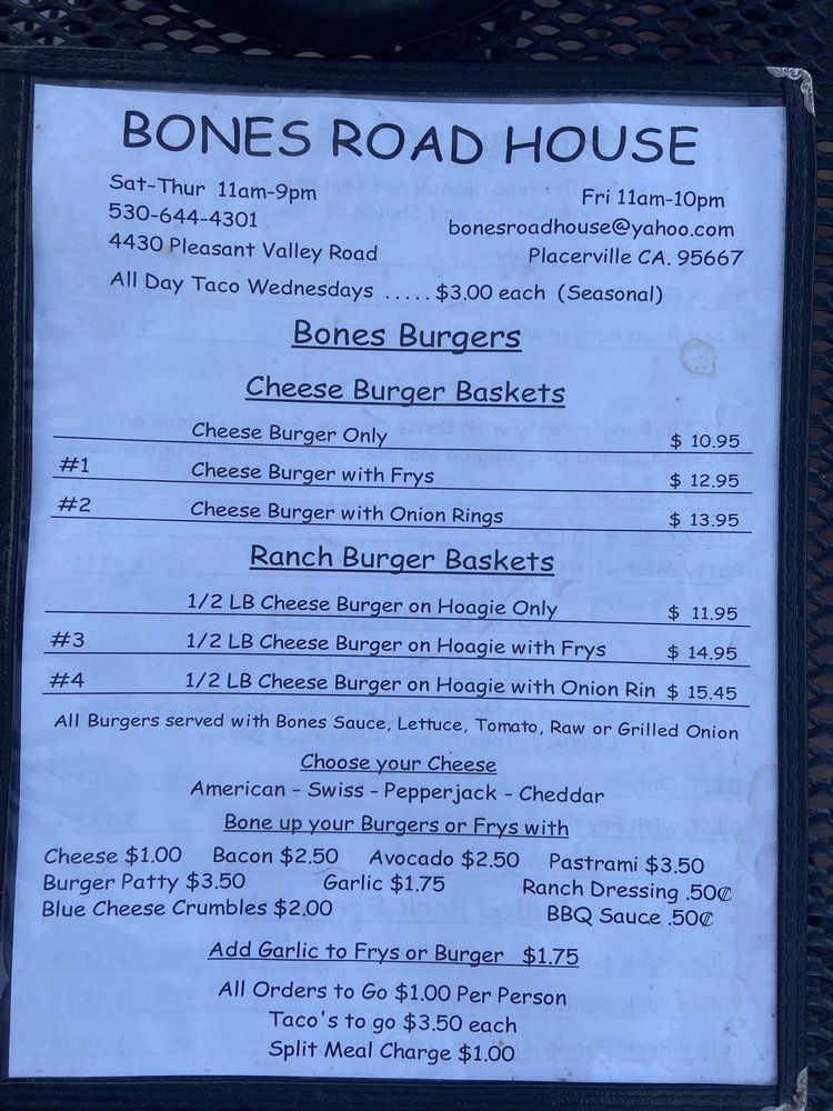 Welcome to Bones Roadhouse, a vibrant music venue nestled in Placerville, CA, where American cuisine meets lively entertainment. This establishment embodies a casual yet energetic atmosphere, perfect for groups and families alike. With a menu that delights the palate, you can indulge in a variety of flavorful dishes, suitable for lunch or dinner.